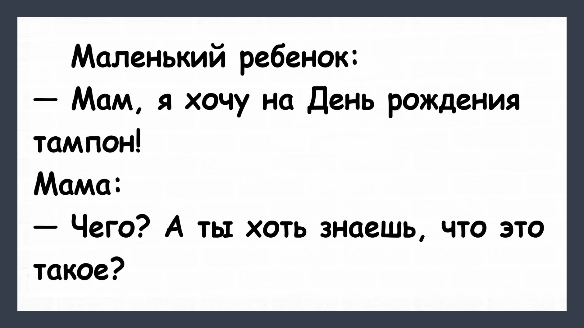 Я хочу на день рождения Тампон! Анекдоты смешные до слез! Юмор! Смех! Позитив! Шутки! Смешные анекдоты для хорошего настроения! Здесь вы найдёте анекдоты, смешные истории, шутки, приколы, юмор про жизнь, семью, работу, отношения и веселые рассказы на каждый день. Подписывайтесь, если любите хороший юмор и анекдоты #анекдоты #анекдотысмешныедослез #анекдотдня #юмор #приколы #шутки #смех #позитив #анекдот Анекдоты, анекдоты смешные до слез, анекдот дня, юмор, приколы, шутки, смех, позитив, анекдот, пикантные анекдоты, остренькие анекдоты, жизненные анекдоты, подборка анекдотов, сборник анекдотов