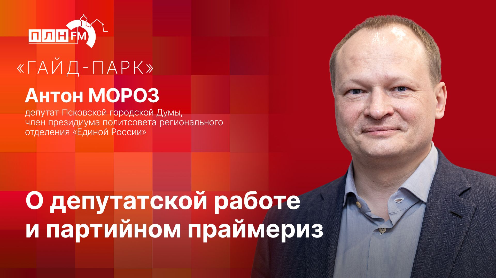Гость: Антон МОРОЗ, депутат Псковской городской Думы, член президиума политсовета регионального отделения «Единой России» Ведущая: Любовь КУЗНЕЦОВА -- Видео ПЛН-ТВ